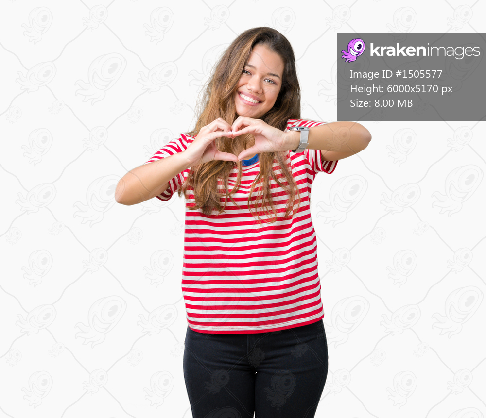 Young beautiful brunette woman wearing stripes t-shirt over isolated background smiling in love showing heart symbol and shape with hands. Romantic concept. - Kraken Images
