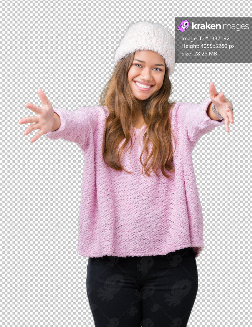 Young beautiful brunette woman wearing sweater and winter hat over isolated background looking at the camera smiling with open arms for hug. Cheerful expression embracing happiness. - Kraken Images