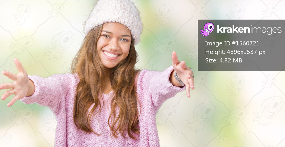 Young beautiful brunette woman wearing sweater and winter hat over isolated background looking at the camera smiling with open arms for hug. Cheerful expression embracing happiness. - Kraken Images