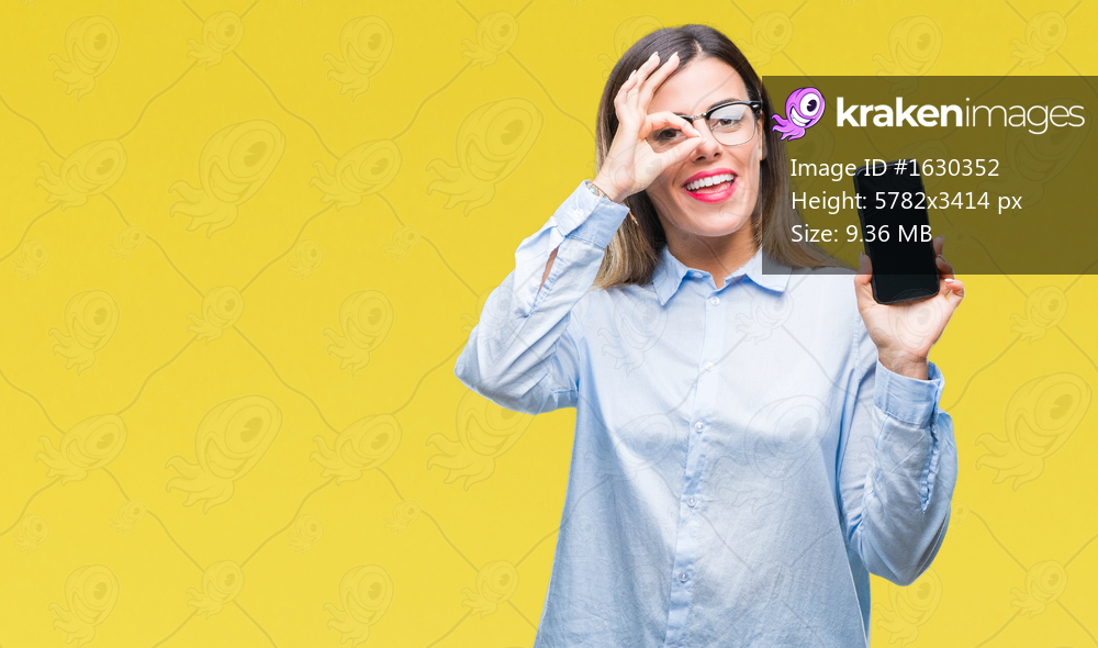 Young beautiful business woman showing blank screen of smartphone over isolated background with happy face smiling doing ok sign with hand on eye looking through fingers - Kraken Images