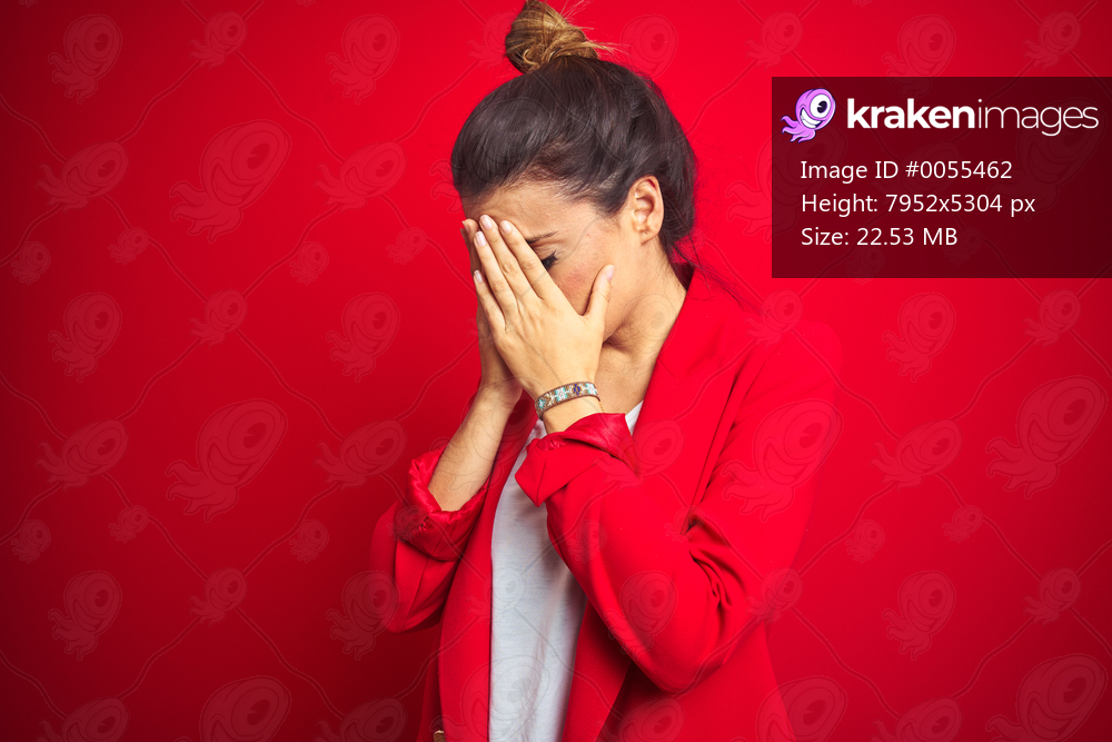 Young beautiful business woman standing over red isolated background with sad expression covering face with hands while crying. Depression concept.