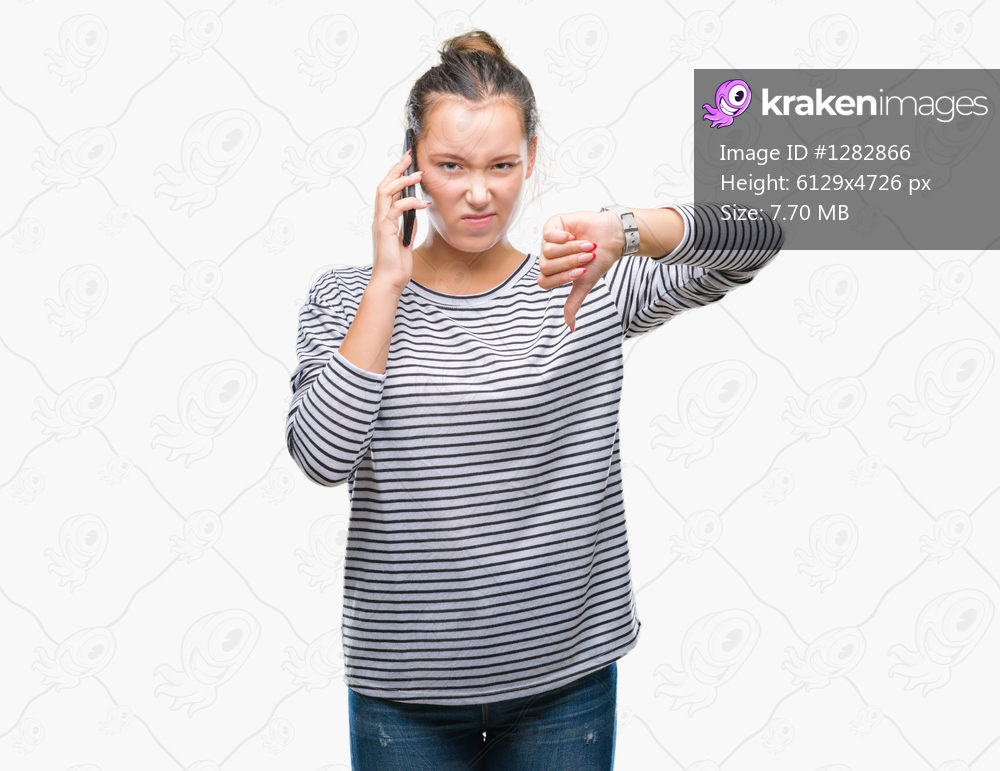 Young beautiful caucasian woman talking on smartphone over isolated background with angry face, negative sign showing dislike with thumbs down, rejection concept - Kraken Images