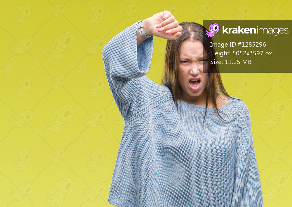 Young beautiful caucasian woman wearing winter sweater over isolated background angry and mad raising fist frustrated and furious while shouting with anger. Rage and aggressive concept. - Kraken Images