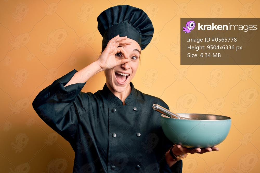 Young beautiful chef woman wearing cooker uniform and hat holding bowl and whisk with happy face smiling doing ok sign with hand on eye looking through fingers - Kraken Images