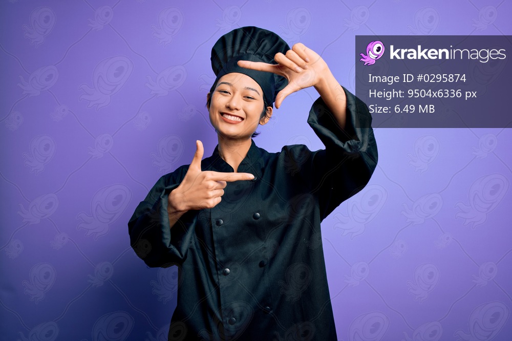 Young beautiful chinese chef woman wearing cooker uniform and hat over purple background smiling making frame with hands and fingers with happy face. Creativity and photography concept. - Kraken Images