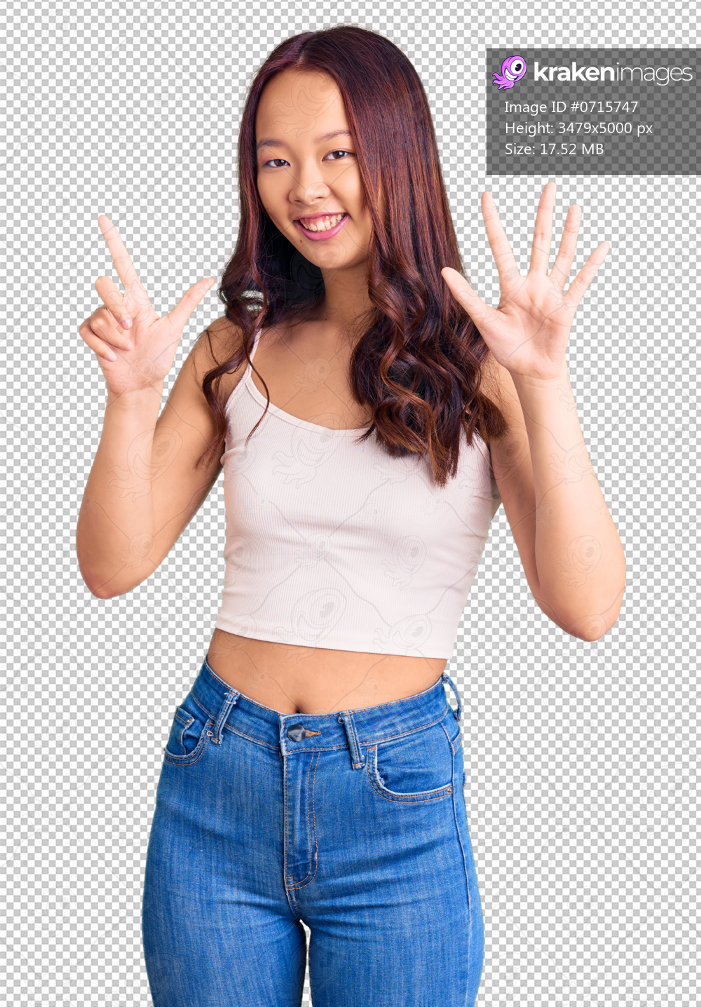 Young beautiful chinese girl wearing casual clothes showing and pointing up with fingers number seven while smiling confident and happy.