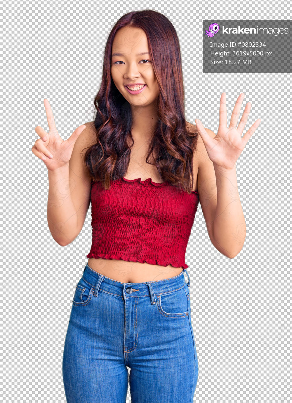 Young beautiful chinese girl wearing casual clothes showing and pointing up with fingers number seven while smiling confident and happy.