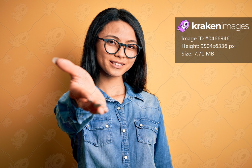 Young beautiful chinese woman wearing casual denim shirt over isolated yellow background smiling cheerful offering palm hand giving assistance and acceptance. - Kraken Images