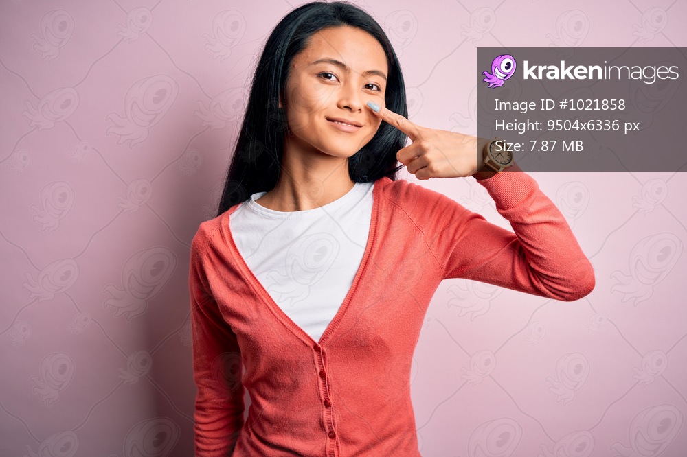 Young beautiful chinese woman wearing casual sweater over isolated pink background Pointing with hand finger to face and nose, smiling cheerful. Beauty concept - Kraken Images
