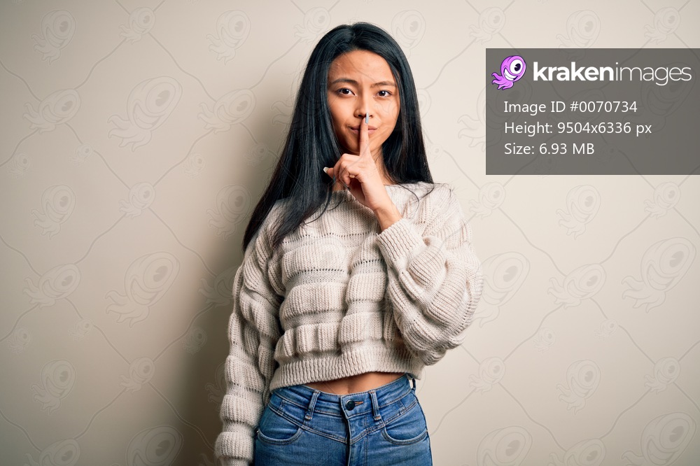 Young beautiful chinese woman wearing casual sweater over isolated white background asking to be quiet with finger on lips. Silence and secret concept. - Kraken Images