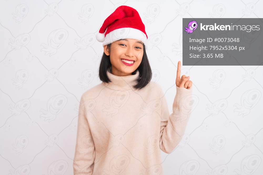 Young beautiful chinese woman wearing Christmas Santa hat over isolated white background showing and pointing up with finger number one while smiling confident and happy. - Kraken Images