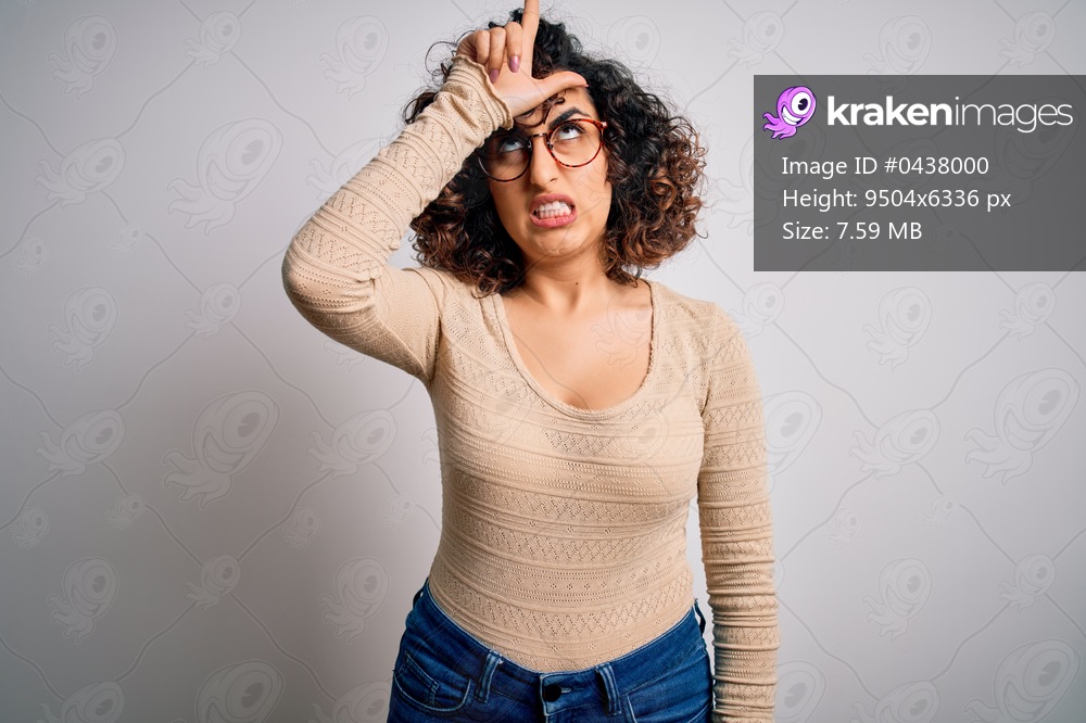 Young beautiful curly arab woman wearing casual t-shirt and glasses over white background making fun of people with fingers on forehead doing loser gesture mocking and insulting. - Kraken Images