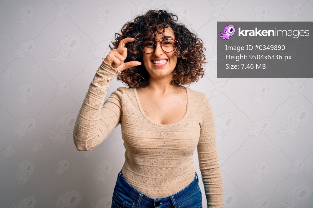 Young beautiful curly arab woman wearing casual t-shirt and glasses over white background smiling and confident gesturing with hand doing small size sign with fingers looking and the camera. Measure concept. - Kraken Images