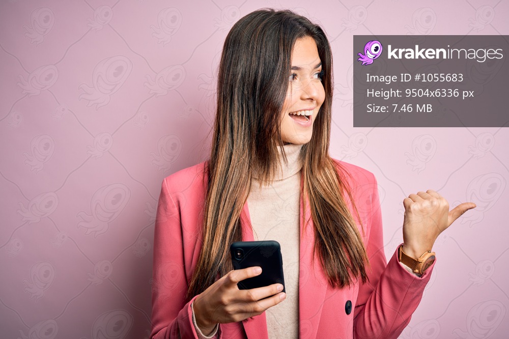 Young beautiful girl having conversation using smartphone over white background pointing and showing with thumb up to the side with happy face smiling