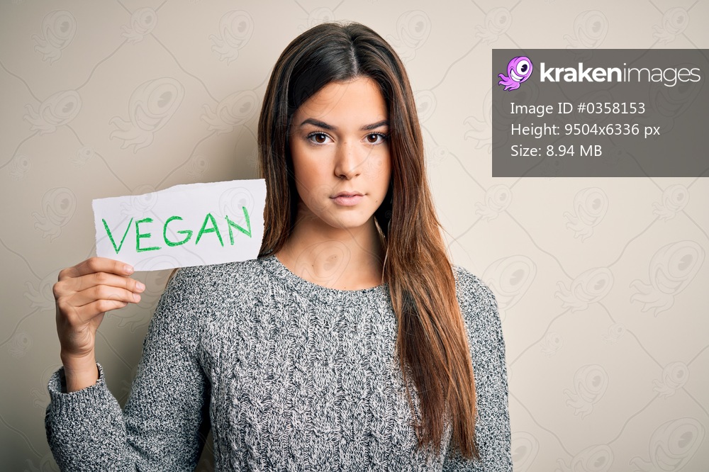 Young beautiful girl holding paper with vegan message over isolated white background with a confident expression on smart face thinking serious