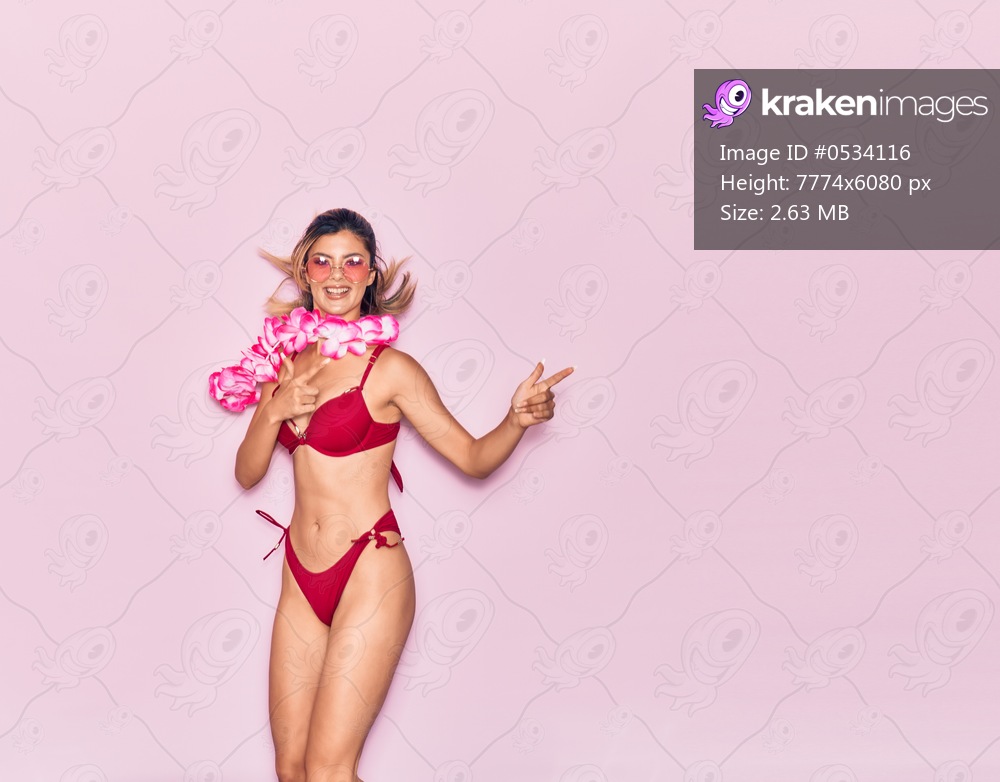 Young beautiful girl on vacation wearing bikini and hawaiian lei smiling happy. Jumping with smile on face pointing with fingers to the side over isolated pink background - Kraken Images