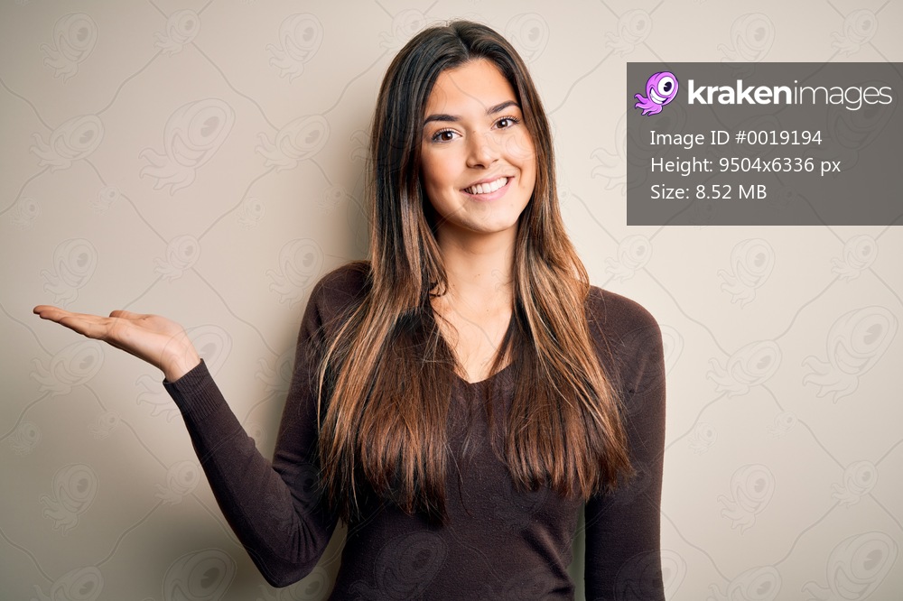 Young beautiful girl wearing casual sweater standing over isolated white background smiling cheerful presenting and pointing with palm of hand looking at the camera. - Kraken Images