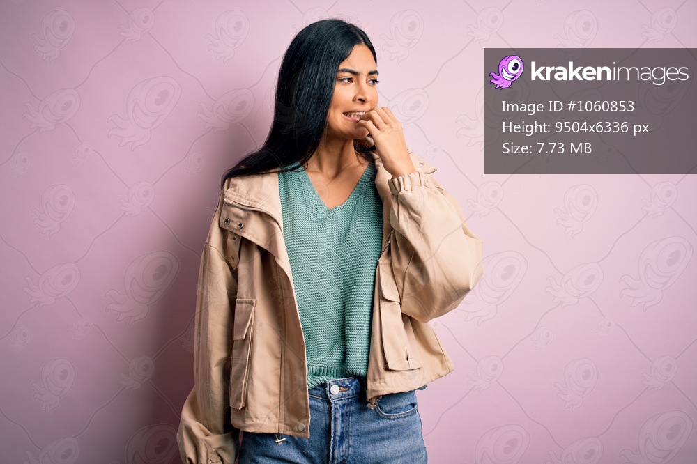 Young beautiful hispanic fashion woman wearing winter jacket and sweater over pink background looking stressed and nervous with hands on mouth biting nails. Anxiety problem. - Kraken Images