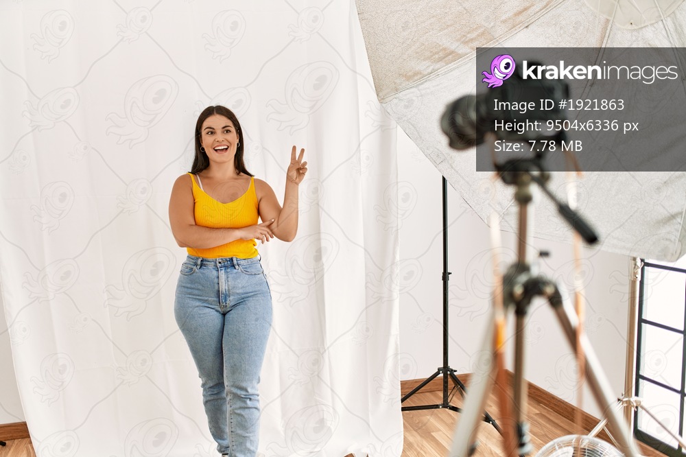 Young beautiful hispanic woman posing as model at photography studio smiling with happy face winking at the camera doing victory sign. number two.
