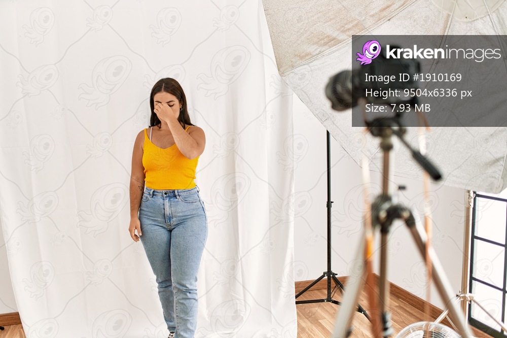 Young beautiful hispanic woman posing as model at photography studio tired rubbing nose and eyes feeling fatigue and headache. stress and frustration concept. - Kraken Images