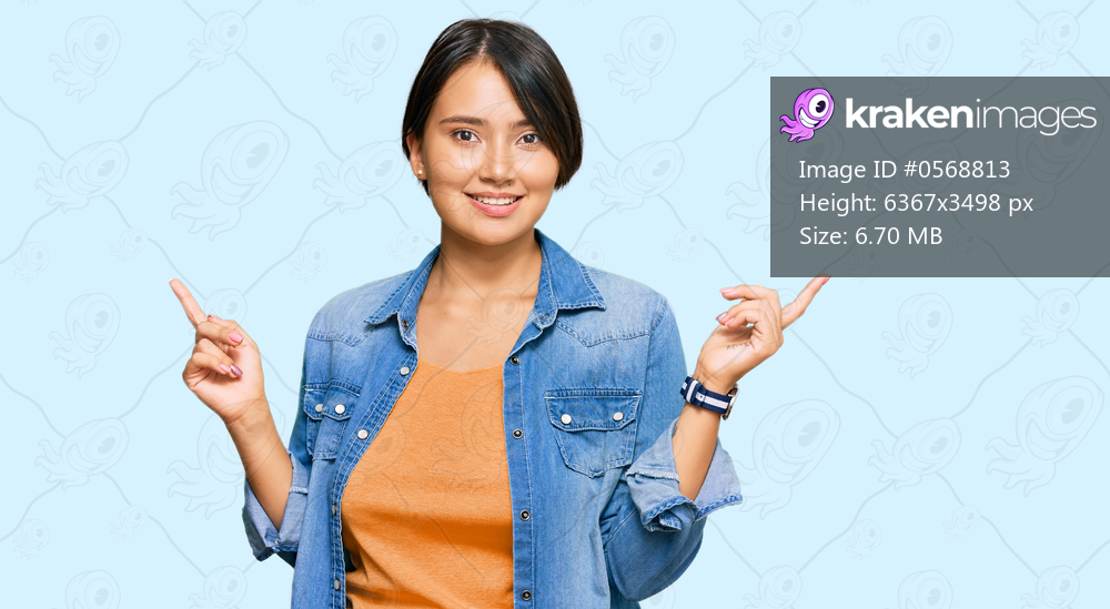Young beautiful hispanic woman with short hair wearing casual denim jacket smiling confident pointing with fingers to different directions. copy space for advertisement - Kraken Images