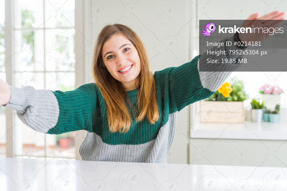 Young beautiful plus size woman wearing casual striped sweater looking at the camera smiling with open arms for hug. Cheerful expression embracing happiness. - Kraken Images