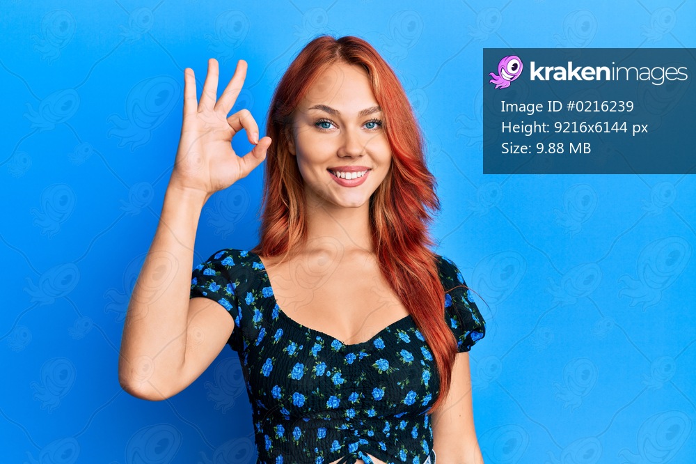 Young beautiful redhead woman wearing casual clothes over blue background smiling positive doing ok sign with hand and fingers. successful expression.