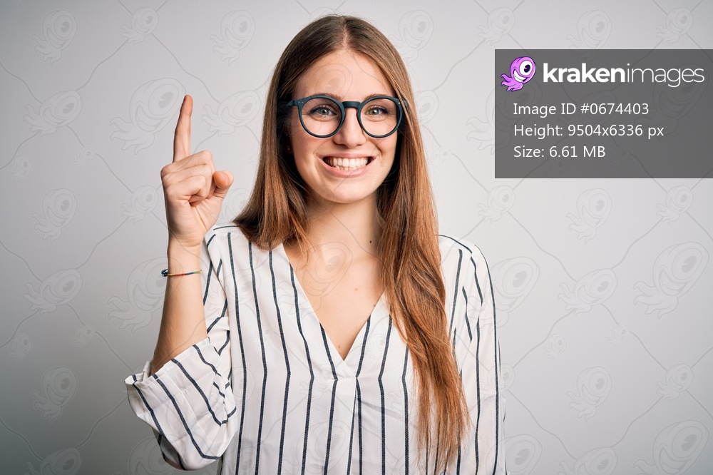Young beautiful redhead woman wearing casual striped t-shirt and glasses pointing finger up with successful idea. Exited and happy. Number one.