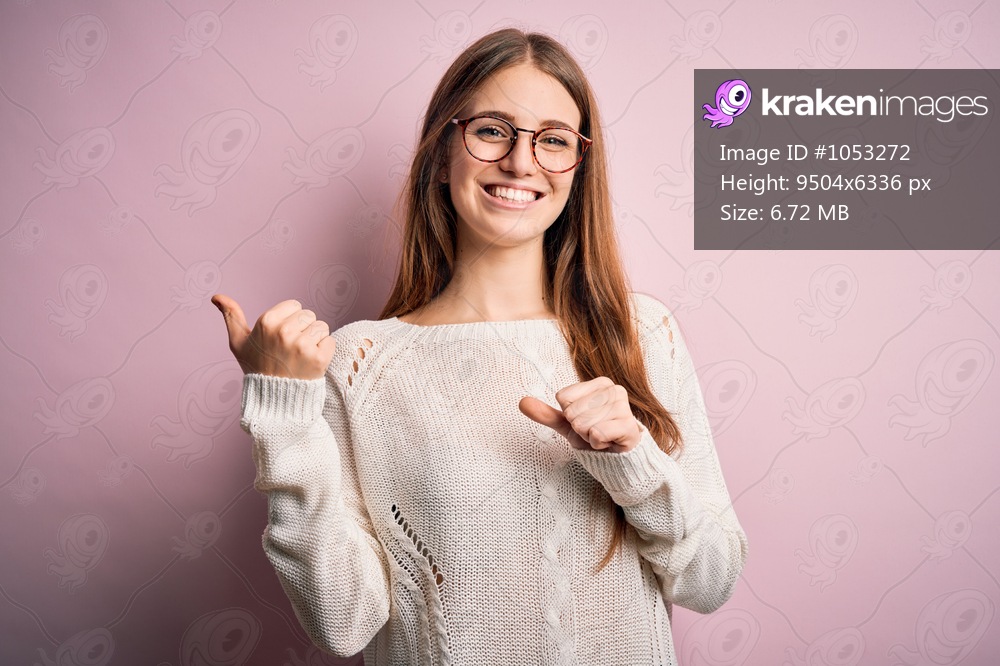 Young beautiful redhead woman wearing casual sweater and glasses over pink background Pointing to the back behind with hand and thumbs up, smiling confident - Kraken Images