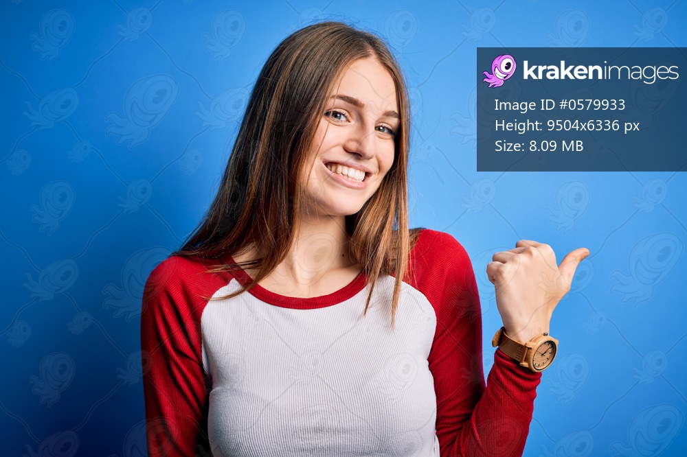 Young beautiful redhead woman wearing casual t-shirt over isolated blue background smiling with happy face looking and pointing to the side with thumb up. - Kraken Images