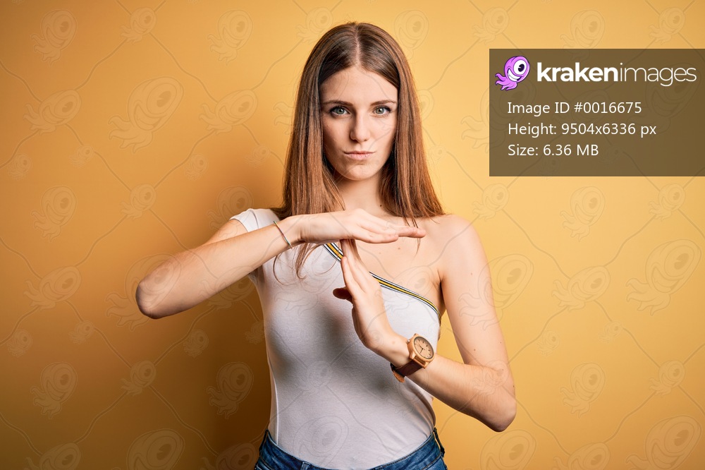 Young beautiful redhead woman wearing casual t-shirt over isolated yellow background Doing time out gesture with hands, frustrated and serious face