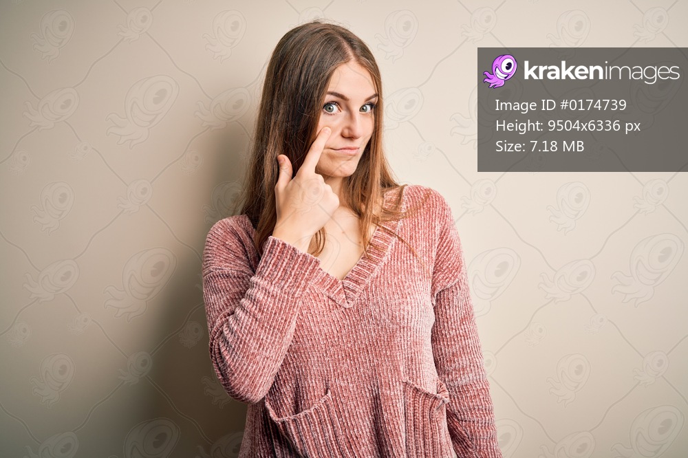 Young beautiful redhead woman wearing pink casual sweater over isolated white background Pointing to the eye watching you gesture, suspicious expression - Kraken Images