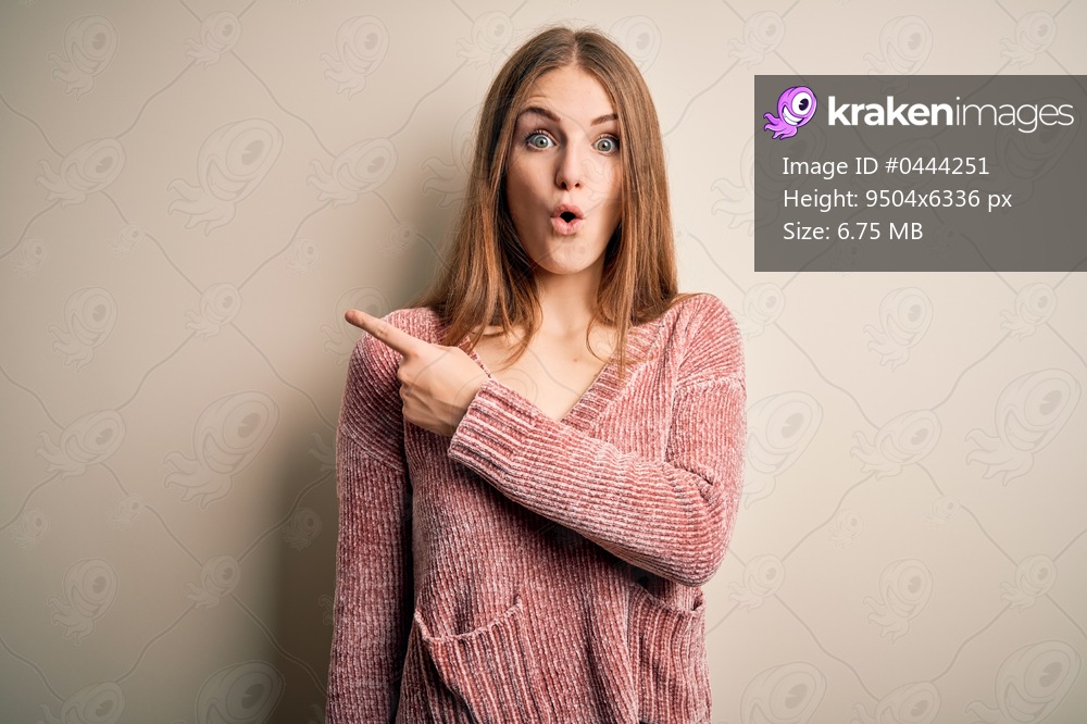 Young beautiful redhead woman wearing pink casual sweater over isolated white background Surprised pointing with finger to the side, open mouth amazed expression. - Kraken Images