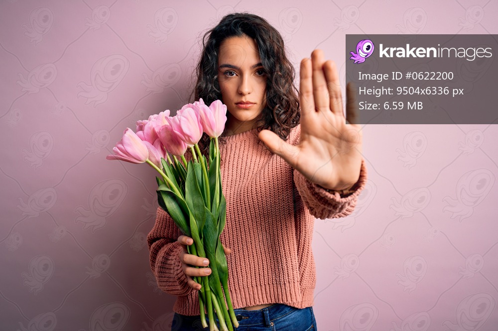 Young beautiful romantic woman with curly hair holding bouquet of pink tulips doing stop sing with palm of the hand. Warning expression with negative and serious gesture on the face. - Kraken Images