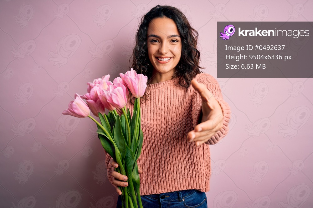 Young beautiful romantic woman with curly hair holding bouquet of pink tulips smiling friendly offering handshake as greeting and welcoming. Successful business. - Kraken Images