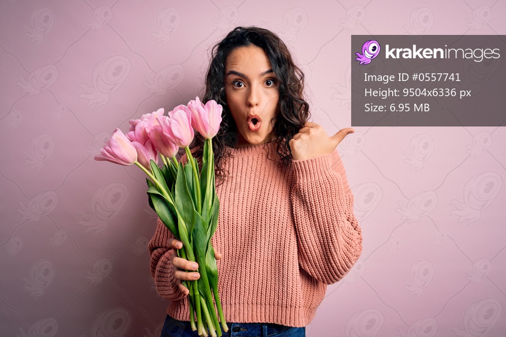 Young beautiful romantic woman with curly hair holding bouquet of pink tulips Surprised pointing with hand finger to the side, open mouth amazed expression. - Kraken Images