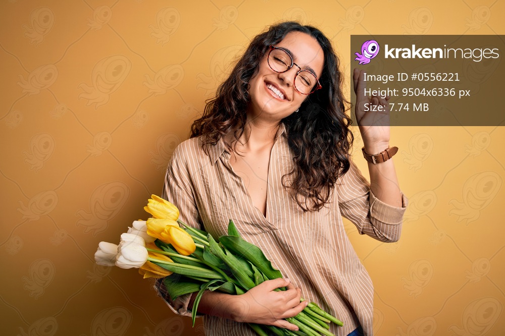 Young beautiful romantic woman with curly hair holding bouquet of yellow tulips gesturing finger crossed smiling with hope and eyes closed. Luck and superstitious concept. - Kraken Images