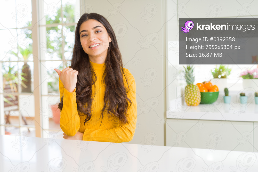 Young beautiful woman at home on white table smiling with happy face looking and pointing to the side with thumb up.