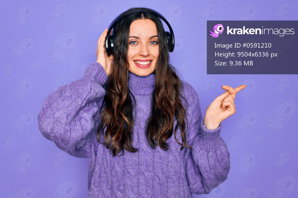Young beautiful woman with blue eyes listening to music and dancing using headphones very happy pointing with hand and finger to the side