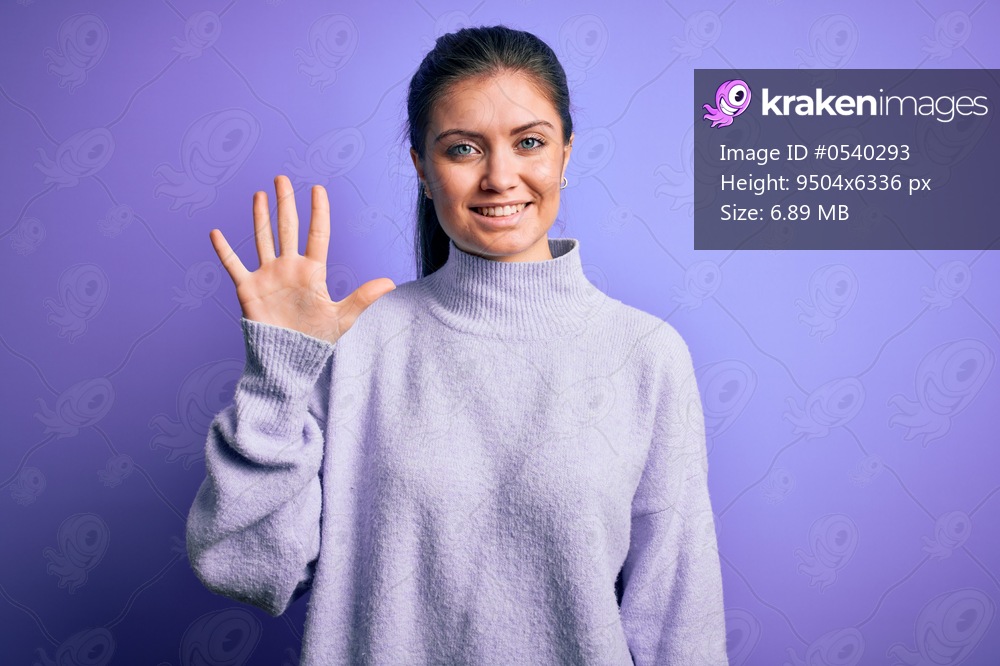 Young beautiful woman with blue eyes wearing casual turtleneck sweater over pink background showing and pointing up with fingers number five while smiling confident and happy. - Kraken Images