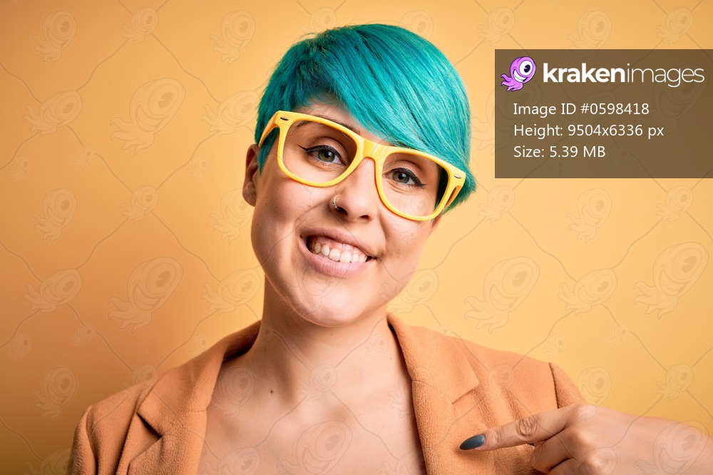 Young beautiful woman with blue fashion hair wearing casual glasses over yellow background with surprise face pointing finger to himself