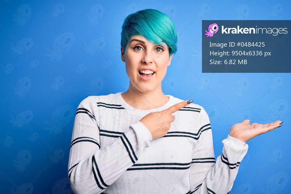 Young beautiful woman with blue fashion hair wearing casual sweater standing at studio amazed and smiling to the camera while presenting with hand and pointing with finger. - Kraken Images