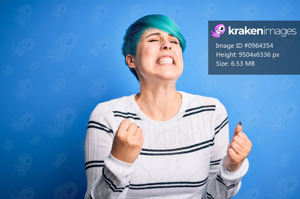 Young beautiful woman with blue fashion hair wearing casual sweater standing at studio very happy and excited doing winner gesture with arms raised, smiling and screaming for success. Celebration concept. - Kraken Images