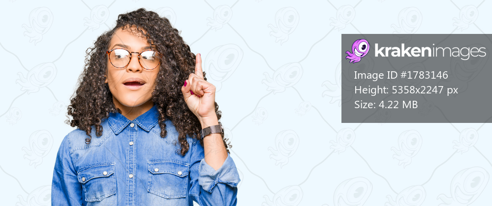 Young beautiful woman with curly hair wearing glasses pointing finger up with successful idea. Exited and happy. Number one.