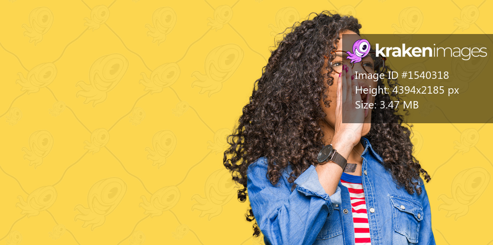 Young beautiful woman with curly hair wearing glasses shouting and screaming loud to side with hand on mouth. Communication concept.