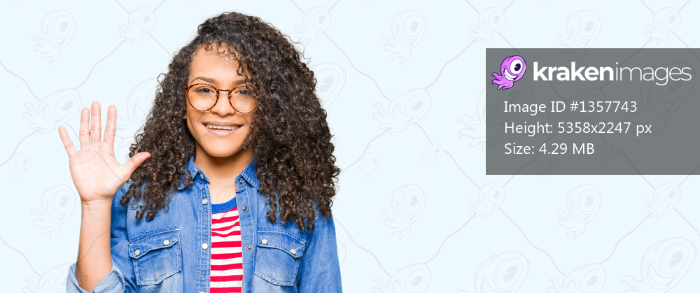 Young beautiful woman with curly hair wearing glasses showing and pointing up with fingers number five while smiling confident and happy.