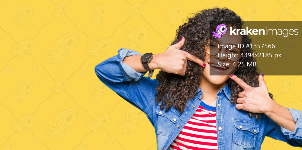 Young beautiful woman with curly hair wearing glasses smiling confident showing and pointing with fingers teeth and mouth. Health concept.