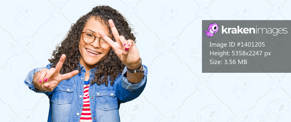 Young beautiful woman with curly hair wearing glasses smiling looking to the camera showing fingers doing victory sign. Number two.