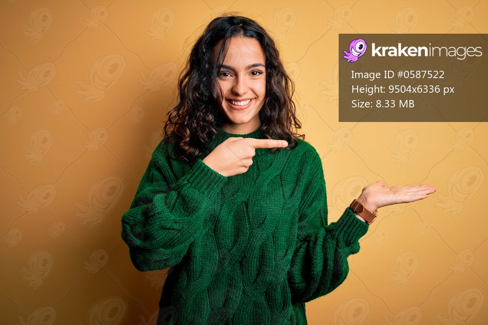 Young beautiful woman with curly hair wearing green casual sweater over yellow background amazed and smiling to the camera while presenting with hand and pointing with finger. - Kraken Images