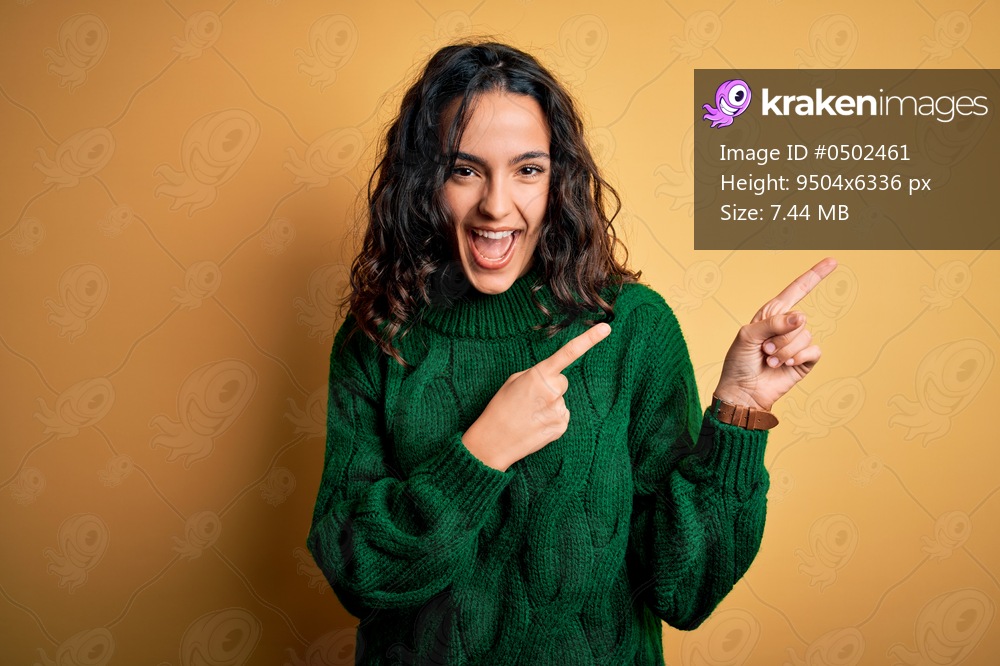 Young beautiful woman with curly hair wearing green casual sweater over yellow background smiling and looking at the camera pointing with two hands and fingers to the side. - Kraken Images